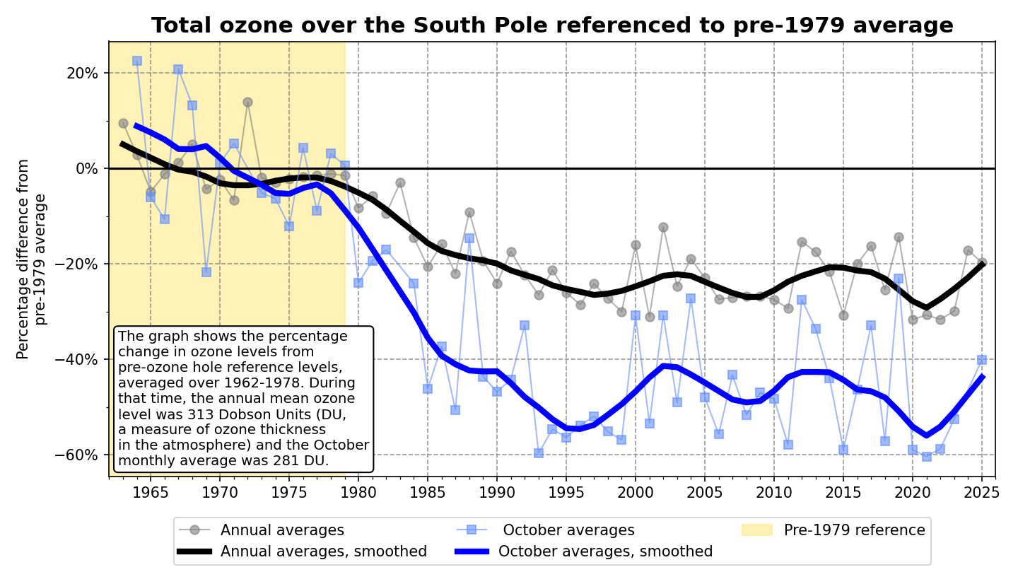 The image above shows changes in total column ozone measurements made annually each year and during the month of October, beginning in 1962, at the Amundsen Scott South Pole Station. The annual and monthly averages in the graph above are smoothed (thick line).